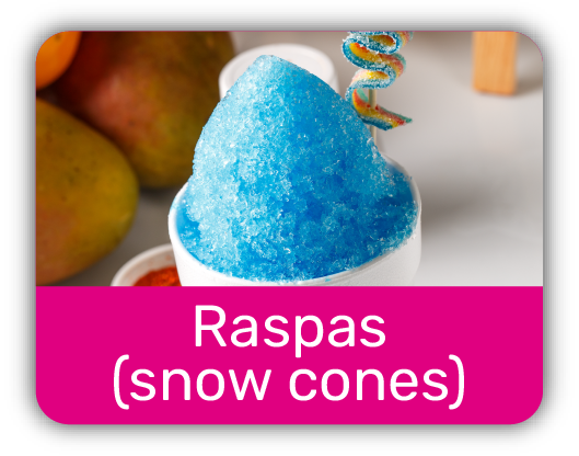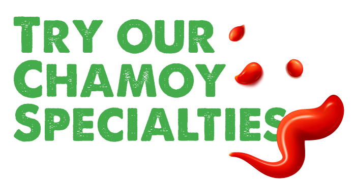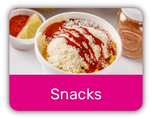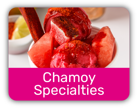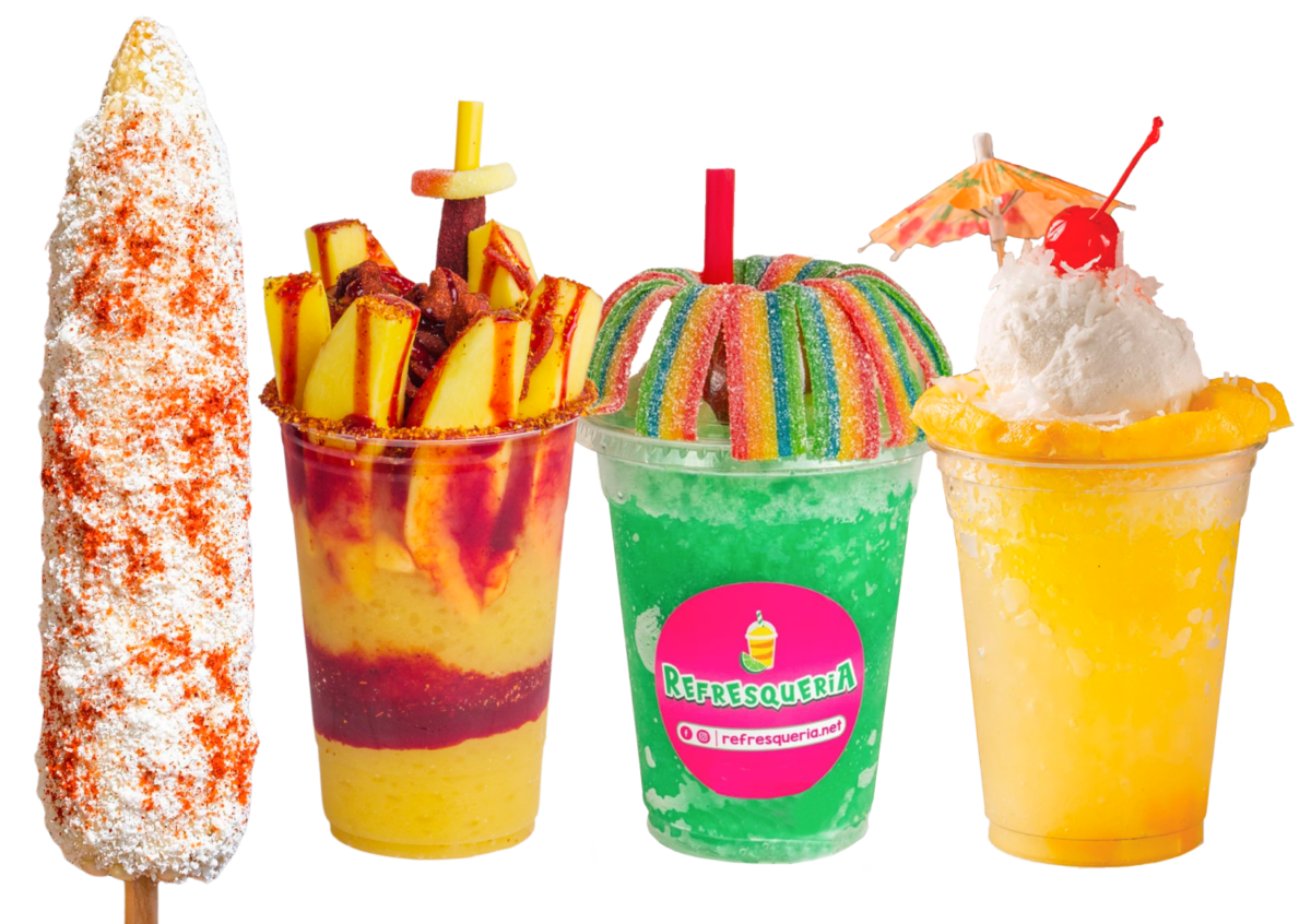 A delicious variety of chamoy specialties and snacks such as elote, nachos, chicharrĂ³n con cueritos.